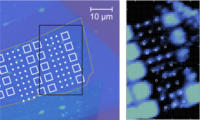 ▲左圖:所需氦離子加工的單層二硫化鉬的光學顯微鏡圖像。白色方塊表示需要固定劑量氦離子照射的區域,白色圓圈表示需要HIM的氦離子束誘發的單點缺陷。右圖:黑色矩形(左)相對應的HIM照射區域的光致發光圖。黑色區域表示不存在缺陷致發光,綠色和藍色區域表示存在缺陷致發光。如圖所示,與缺陷有關的發光位置與氦離子誘發缺陷的空間位置完全一致。