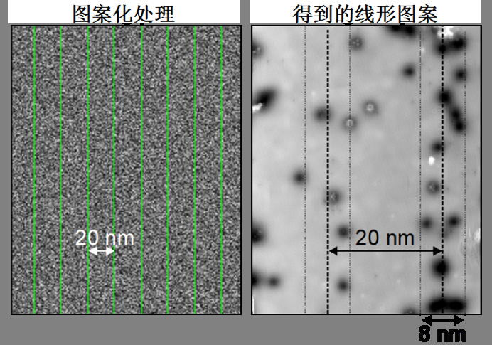 ▲利用氦離子顯微鏡進行圖案加工處理。左圖:綠線代表所需加工的間距為20 nm的線形圖案。右圖:利用掃描隧道顯微鏡(STM)解析得到的單層二硫化鉬的線形圖案。從結果中我們可以看到線條的間距為所設計的20 nm,同時我們也發現每條線的平均寬度約為8 nm。STM的測量是在美國伯克利的Molecular Foundry與Bruno Schuler和Alex Weber-Bargioni共同完成的。