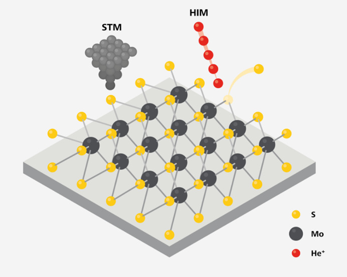 ▲利用氦離子顯微鏡(HIM)對二維材料進行高分辨率圖案加工。此圖展示了氦離子束(紅色)照射下的單層二硫化鉬以及利用掃描隧道顯微鏡(STM)進行后續研究。